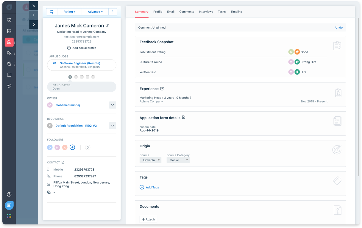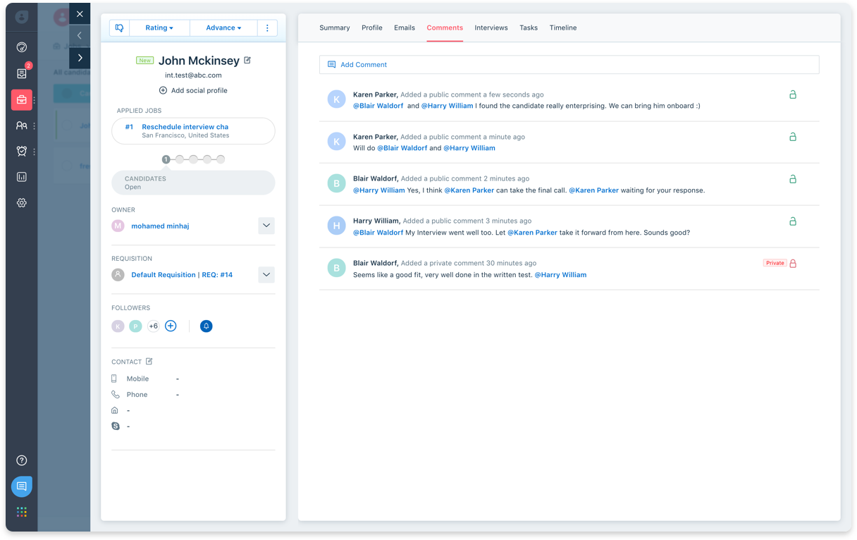 Invite and add your team members to Freshteam - hiring managers, panel members, interviewers, all of them. Collaborating inside Freshteam is lot easier than when using emails. You can view candidate profiles, leave comments for each other and follow up on each other conversations with candidates - all in one place. Even scheduling interviews, and coordinating with candidates and interviewers is less chaotic and way more organized with Freshteam.